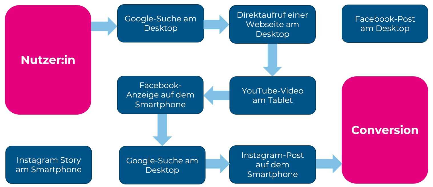 Eine Customer Journey (Nutzerpfad) beschreibt den Weg eines Nutzers von der ersten Interaktion bis zur Conversion. Dieser Weg besteht aus mehreren Touchpoints, z. B.: