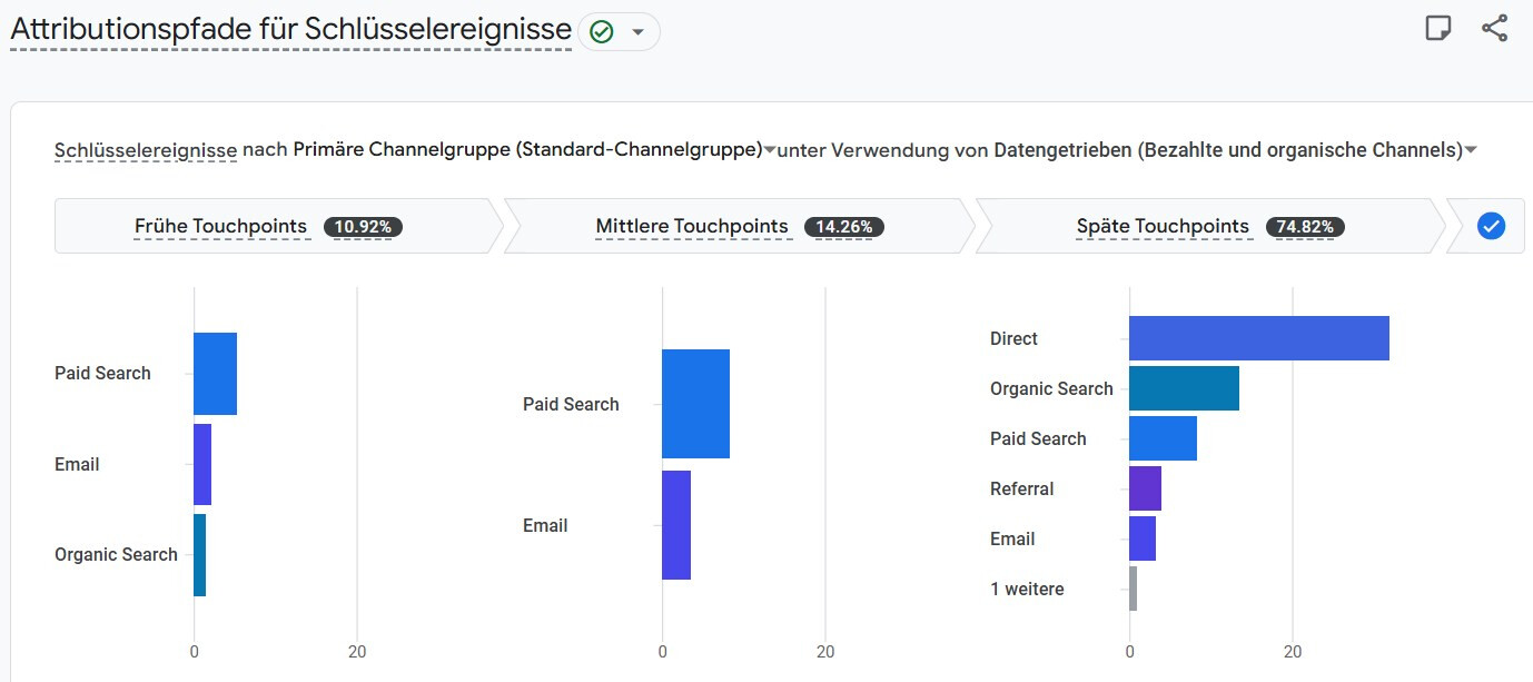 Im Bericht werden frühe, mittlere und späte Touchpoints visuell dargestellt. Diese Grafik hilft, zu verstehen, welche Kanäle vorbereitend wirken und welche eher konvertierend.