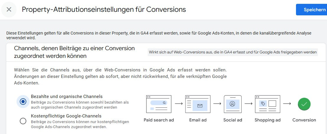 Auswahl, ob die Conversions nur den kostenpflichtigen Google-Kanälen zugeordnet werden oder den bezahlten und organischen Kanälen
