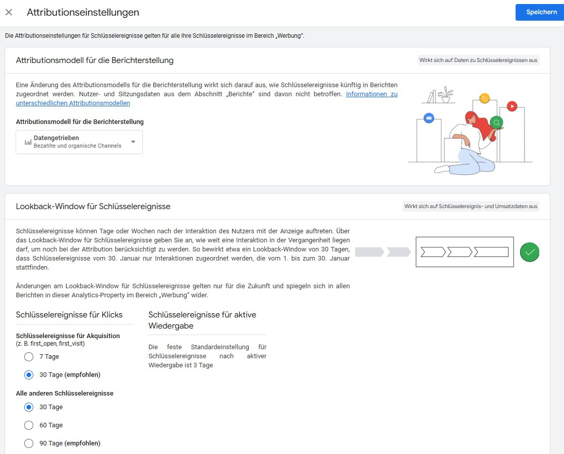 Die grundlegenden Einstellungen zur Attribution werden in GA4 zentral vorgenommen:
