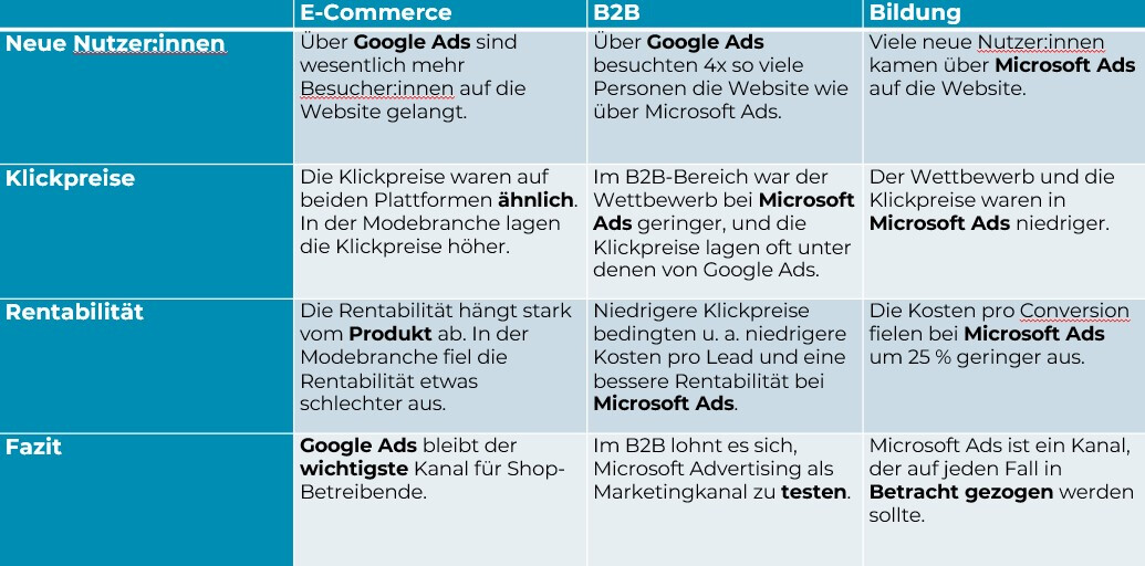 Um diese Frage zu beantworten, haben wir die Performance von Microsoft Ads und Google Ads in verschiedenen Branchen verglichen. Dabei lag der Fokus auf Such-, Shopping- und Performance-Max-Kampagnen. Du möchtest mehr darüber erfahren? Dann lies gerne hier nach.