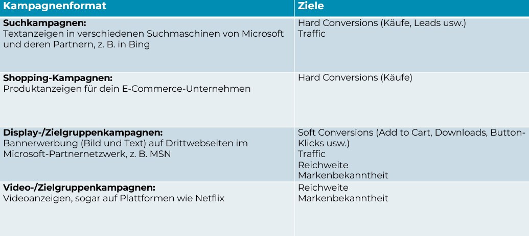 Um herauszufinden, ob sich Microsoft Ads für dein Unternehmen lohnt, ist es wichtig, deine Marketingziele mit den verfügbaren Kampagnenformaten abzugleichen. Microsoft Ads bietet eine Vielzahl von Formaten, die du nutzen kannst, um unterschiedliche Ziele zu erreichen. Die wichtigsten Formate und ihre Ziele sind: