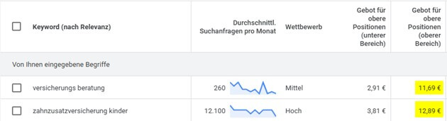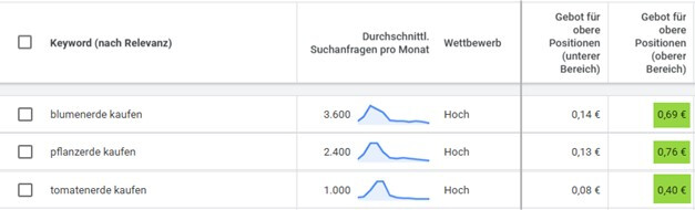 Die Höhe des Budgets hängt stark von den Klickpreisen der Keywords (Suchbegriffe) in deiner Branche ab. In wettbewerbsintensiven Bereichen wie Versicherungen, Finanzen oder Mode sind Klickpreise deutlich höher als in anderen Märkten. Um sich darüber im Vorfeld einen Überblick zu verschaffen, kann man den Keyword Planner aus Google Ads nutzen.