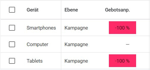 Gebotsanpassung um -100 %, wenn ein Endgerät ausgeschlossen werden soll