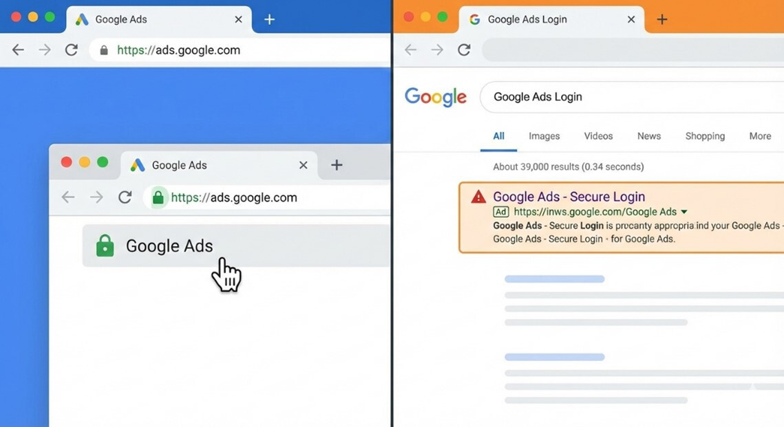 Die Masche: Hacker schalten manchmal eigene Anzeigen auf Suchbegriffe wie „Google Ads Login“. Wer nicht genau hinschaut, landet auf einer täuschend echt aussehenden Fake-Seite. Gibst du dort dein Passwort ein, haben die Angreifer sofort Zugriff auf dein Google-Ads-Konto.
