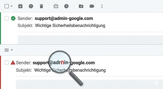 Die Falle: Eine E-Mail von einem Absender wie support@adrnin-google.com oder noreply@rnicrosoft.com (geschrieben mit „rn“) wirkt im Posteingang absolut seriös.