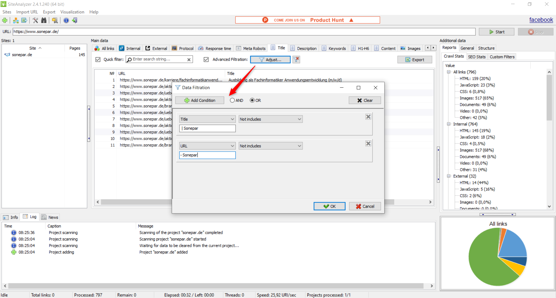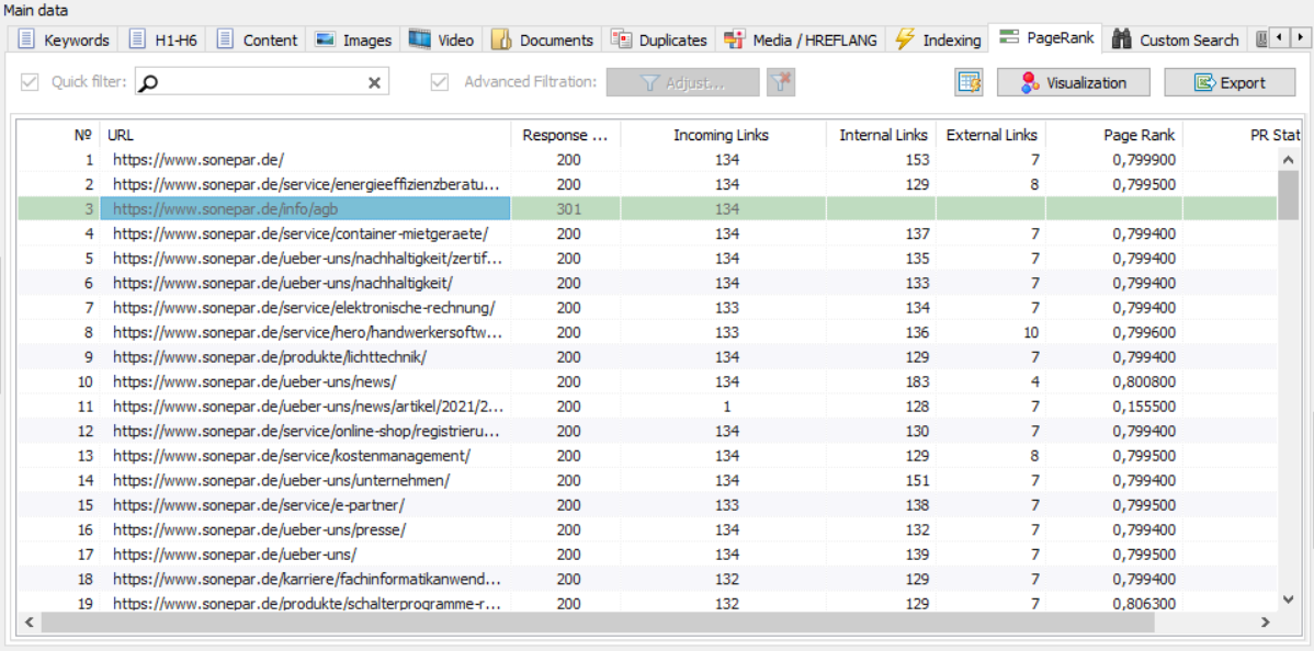 Insgesamt ist SiteAnalyzer im Vergleich zu Beam Us Up das mächtigere Tool. So gibt es z. B. einen hreflang-Check für internationale Websites und eine PageRank-Berechnung für die interne Verlinkung. Wie im Screenshot oben zu sehen ist, gibt es auch ein Feature, das dem „großen Vorbild“ Screaming Frog SEO Spider durchaus überlegen ist: So kann man direkt im SiteAnalyzer Filterkombinationen zusammenstellen und dann die Ergebnisse danach filtern. Das kann gerade bei bestimmten Fragestellungen durchaus praktisch sein.