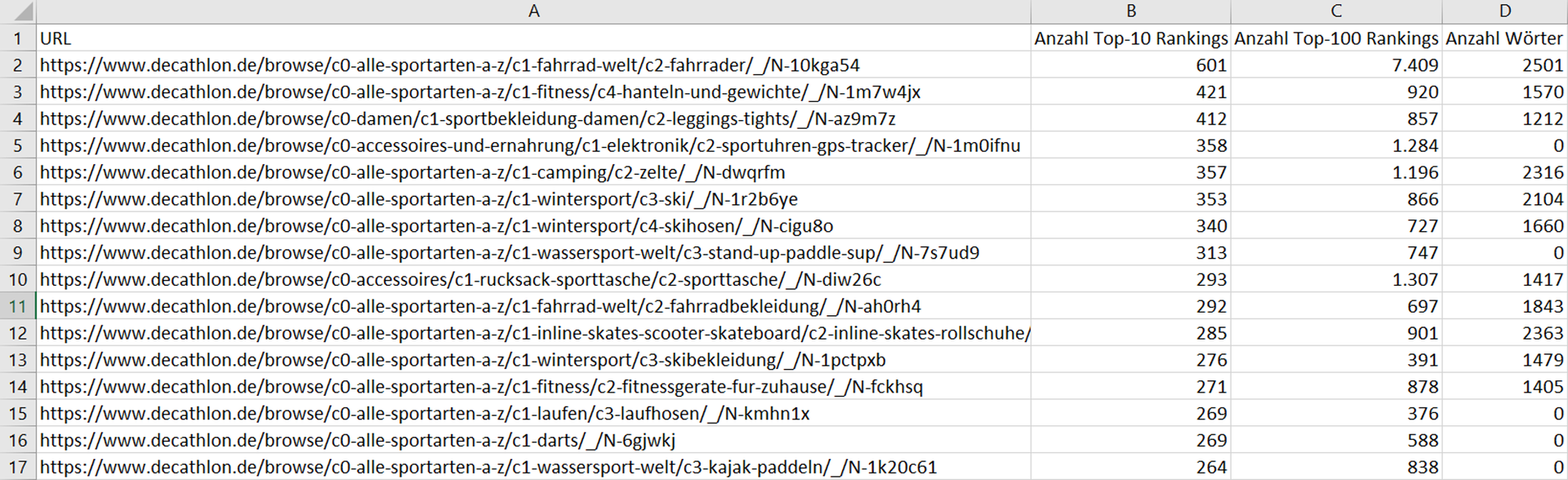 Nun könnte man versuchen, eine Korrelation zwischen der Anzahl der Top-10-Rankings einer Kategorieseite und der Wortanzahl zu ermitteln. Aber bei Korrelationen bleibt das alte Problem „Korrelation vs. Kausalität“. Wenn Decathlon.de sich z. B. entscheiden würde, für alle gut rankenden Seiten SEO-Texte zu erstellen, gäbe es zwar eine Korrelation, aber keine Kausalität. Die Seiten würden dann nicht wegen der Texte ranken, sondern vielleicht nur trotz der Texte. Und da ich keine Einblicke in die SEO-Prozesse von Decathlon.de habe, spare ich mir die Berechnung der Korrelation.